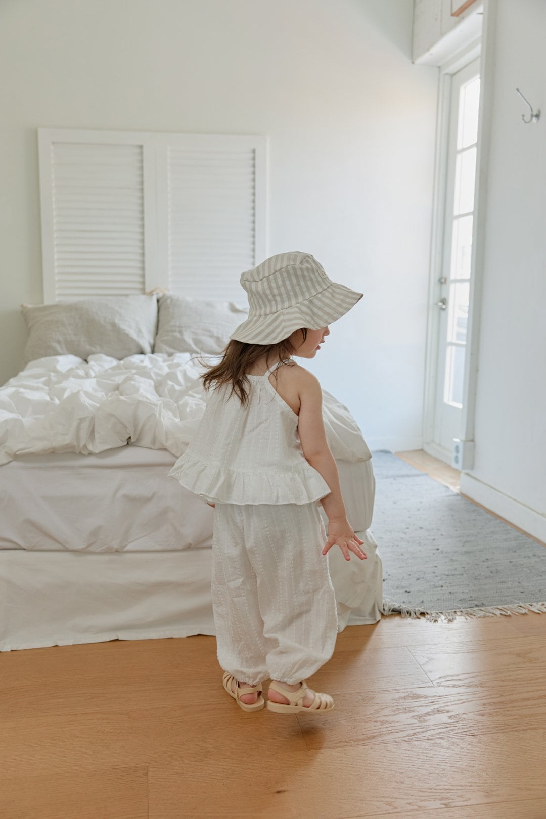 ・夏の陽だまりに溶け込む、柔らかなストライプ。強い日差しを優しく遮りながら、お子さまの愛らしい横顔を縁取ります ⚘
